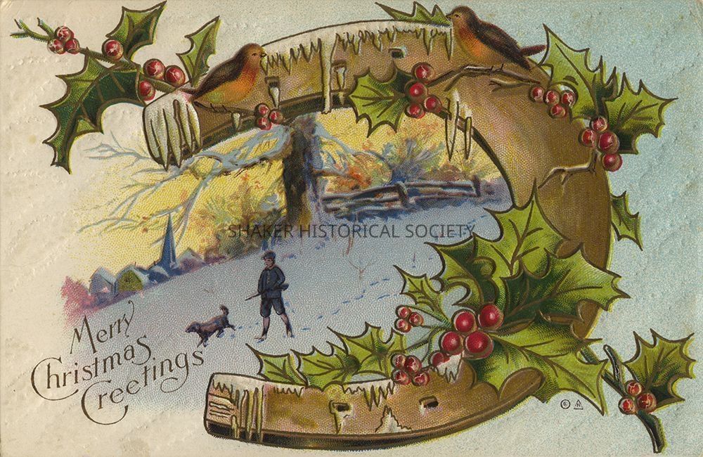 Embossed Christmas postcard published by E. Nash depicting a boy with a rifle and a dog standing in the snow, framed by a horseshoe decorated with holly and English robins. The phrase “Merry Christmas Greetings” is printed in the lower left corner. The copyright symbol and E. Nash logo ("N" within a triangle) are visible below the horseshoe in the bottom right. Design is No. 44 in the publisher's Christmas Series.Category
