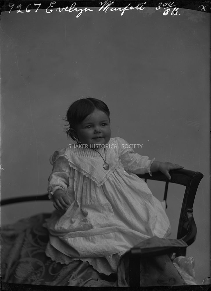 Glass plate negative showing an infant girl, identified at the top as Evelyn Murfett, in a chair.