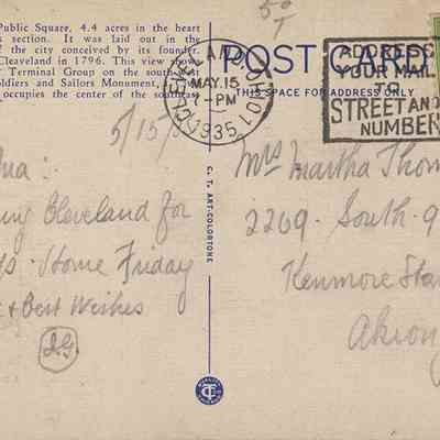 The postcard, postmarked May 15, 1935, was sent by [J.T.?] in Cleveland, Ohio to Mrs. Martha Thompson at 2269 South 9th St., Kenmore Station, Akron, Ohio. The handwritten message on the back reads: "Hello Ma: Seeing Cleveland for 2 days. Home Friday. Love + Best Wishes [J.T?]"Subject Person/Organization