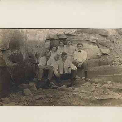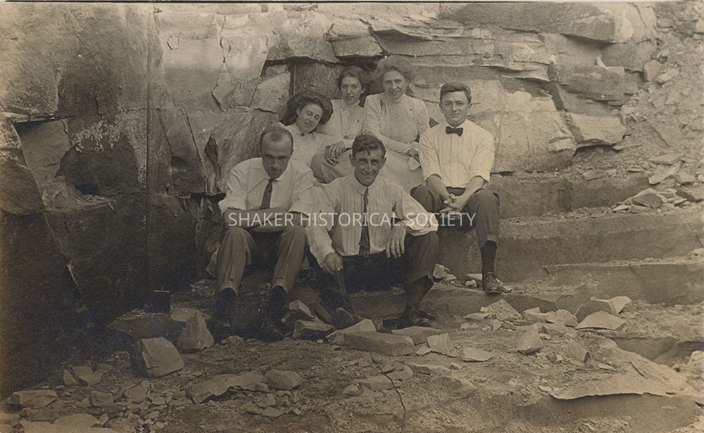 Undated black-and-white photograph of three men and three women at the stone quarry, later the National Guard Armory and now the Cleveland Skating Club, near Doan Brook Gorge. The photo is taped to a piece of paper identifying the people pictured. Back row: Anne Nickels, Florence Swallow, Julia Jackel, and Ben Brugge. Front Row: William J. Van Aken and Percy Close.Photograph Details