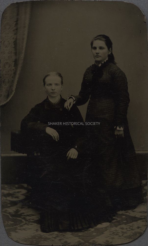 Tintype portrait of two young women, one seated and one standing, with rounded corners. Faint handwriting on verso reads: "Aunt Lottie and Cousin Dille Mallory, Freeport, Ill." Writing is not visible in scan of back.Photograph Details