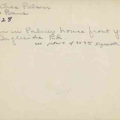 Undated black-and-white photograph of a man and three women drinking water next to a well in the front yard of the Palmer House at 3535 Ingleside. Handwritten notes on verso identify two of the women as Mrs. Charles Palmer (Luna Palmer) and Mrs. Louis Baus.Photograph Details