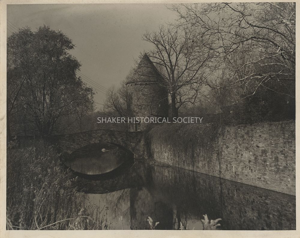 Sepia-toned black-and-white photograph of the stone tower and bridge across the farm group moat at Daisy Hill, the Van Sweringen's country estate in Hunting Valley. Photo is identical to 2025.13.689, 2025.13.690, and 2025.13.691 but printed with a darker exposure.Photograph Details