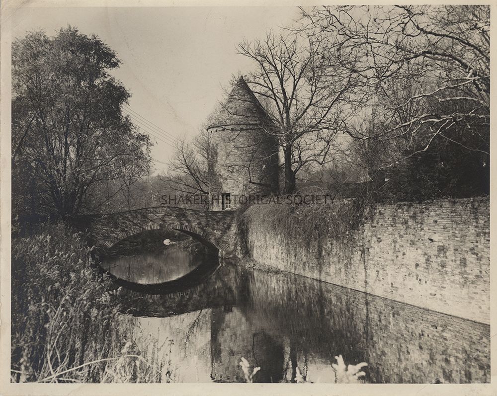 Sepia-toned black-and-white photograph of the stone tower and bridge across the farm group moat at Daisy Hill, the Van Sweringen's country estate in Hunting Valley. Photo is identical to 2025.13.666, 2025.13.690, and 2025.13.691 but printed with a brighter exposure.Photograph Details
