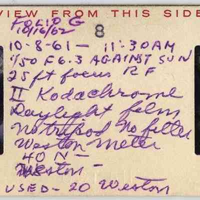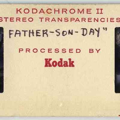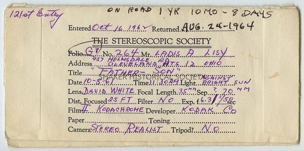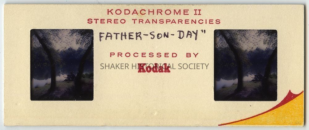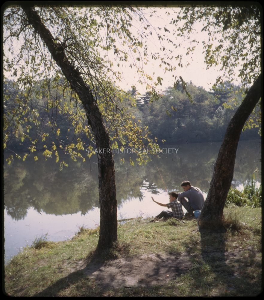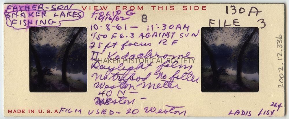 Color Kodachrome stereograph by Ladis Lisy of a father and son fishing on the banks of Lower Lake. Slides are housed within a labeled envelope within a Stereoscopic Society envelope with information about the photograph and critiques/comments from other members of the Society.Photograph Details