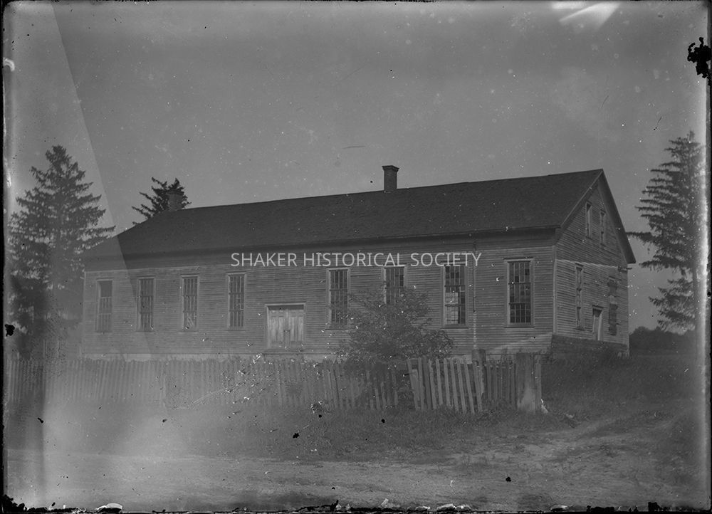 Glass plate negative showing a southwest view of the Center Family's meeting house along Lee Road. Image is very similar to P-346/347.Photograph Details