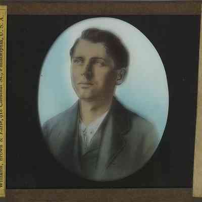 Hand-colored black-and-white glass lantern slide showing Leon Czolgosz, President William McKinley's assassin. A label for Williams, Brown & Earle of Philadelphia, Pennsylvania, which manufactured and sold optical projection devices, is along the left side, and a label for William E. Stieren Co. of Pittsburgh, Pennsylvania is along the right. Czolgosz lived with his father, stepmother and brothers and sisters on a small farm on the north side of what is now Harvard Road, just east of Richmond Road near the Orange Township line.Photograph Details