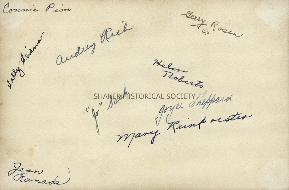Black-and-white photograph of female students and teacher in an unidentified 1946 Shaker Junior High School class. Autographs on verso.Photograph Details