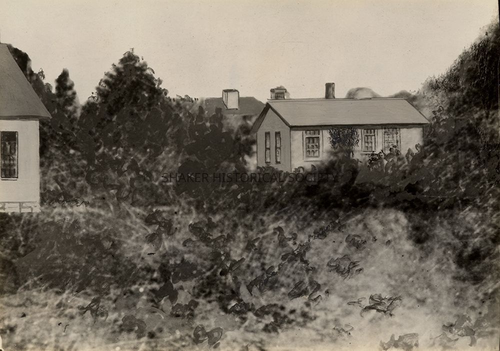 Baus description: "[Plate 25] Garden and east side (rear) of meeting [house] looking toward Lee Rd. At the right probably the first church built in 1826; and beyond this the roof of middle family house. At left a part of the wash house can be seen.