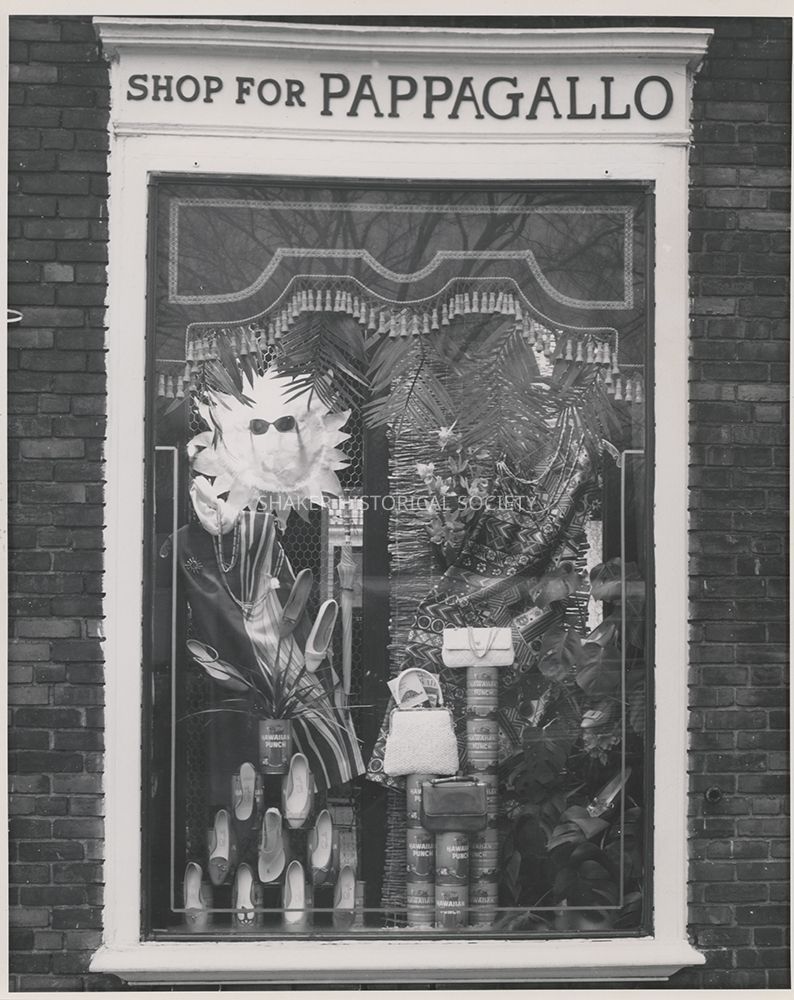 Undated black-and-white photograph of a Franklin Simon window display in Shaker Square showcasing Pappagallo shoes. The back of the photograph features a handwritten note "Please return to" and a stamped address for The Shaker Square Association, Attn: Mary Jane Weiss, Cleveland, Ohio 44120.Photograph Details