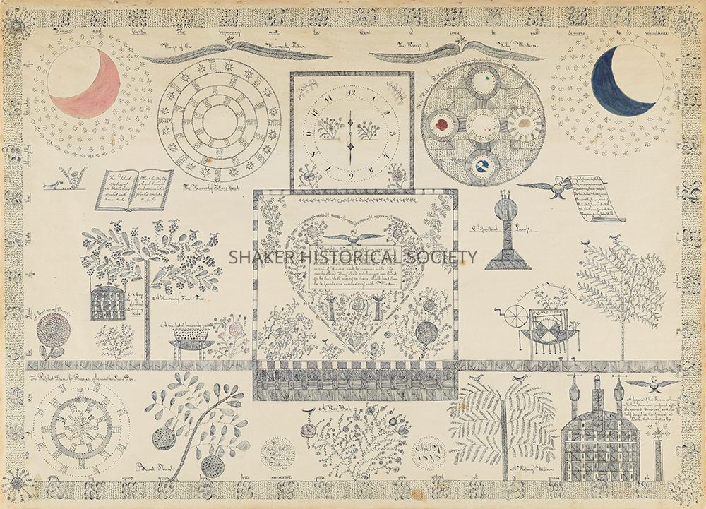 Color reproduction print of "From Holy Mother Wisdom to Hannah Ann Treadway (Shaker Inspirational Drawing)," attributed to Sarah Bates, 1845. Original drawing held in the collection of the Philadelphia Museum of Art, accession number 1963-160-2.Location