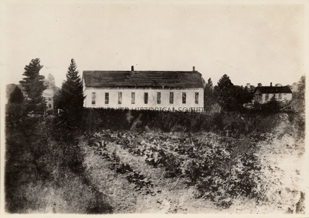Baus description: "[Plate 25] Garden and east side (rear) of meeting looking toward Lee Rd. At the right probably the first church built in 1826; and beyond this the roof of middle family house. At left a part of the wash house can be seen.
