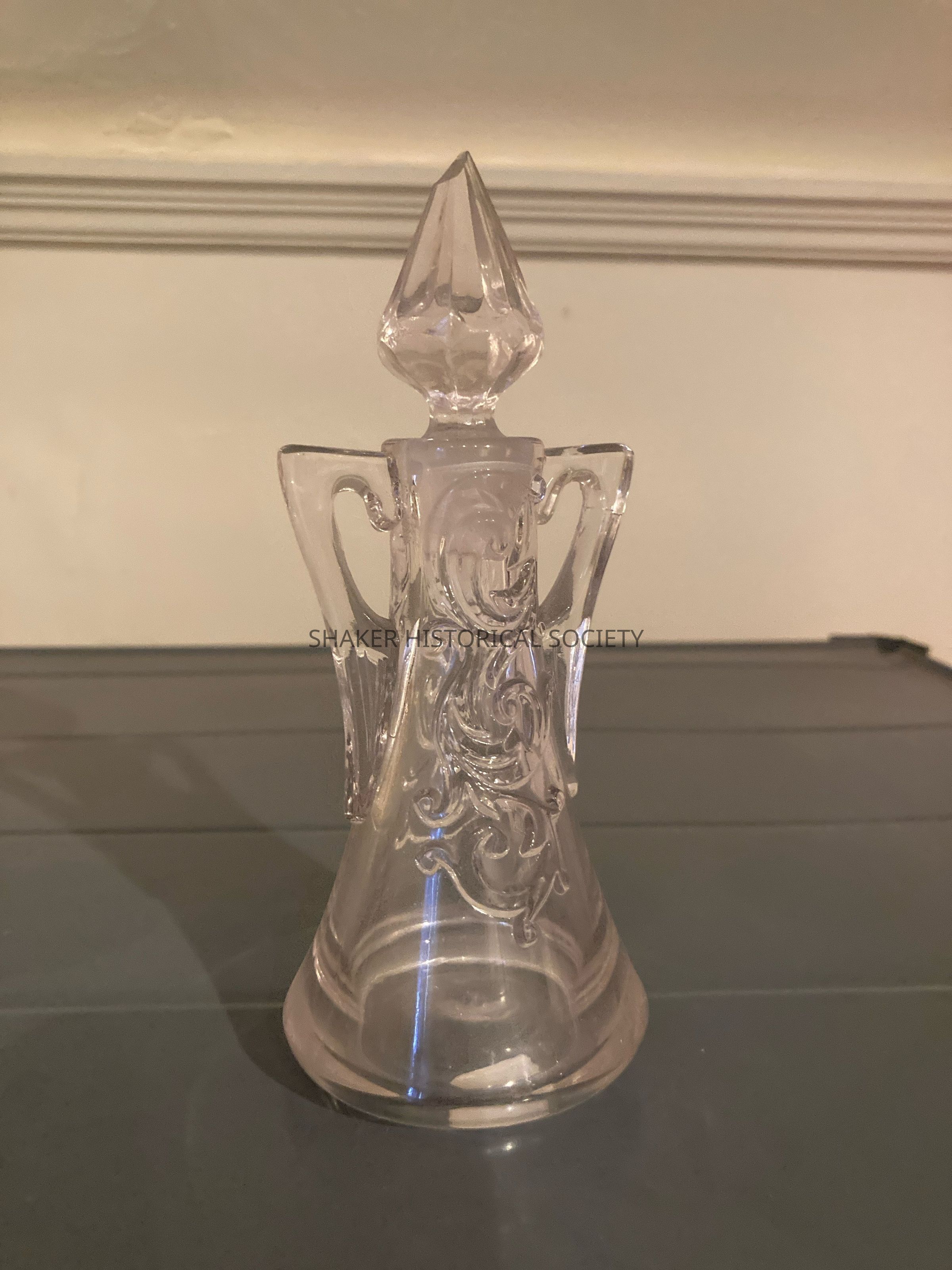 Small glass cruet bottle with pointed glass stopper, round base, and two handles.Acquisition