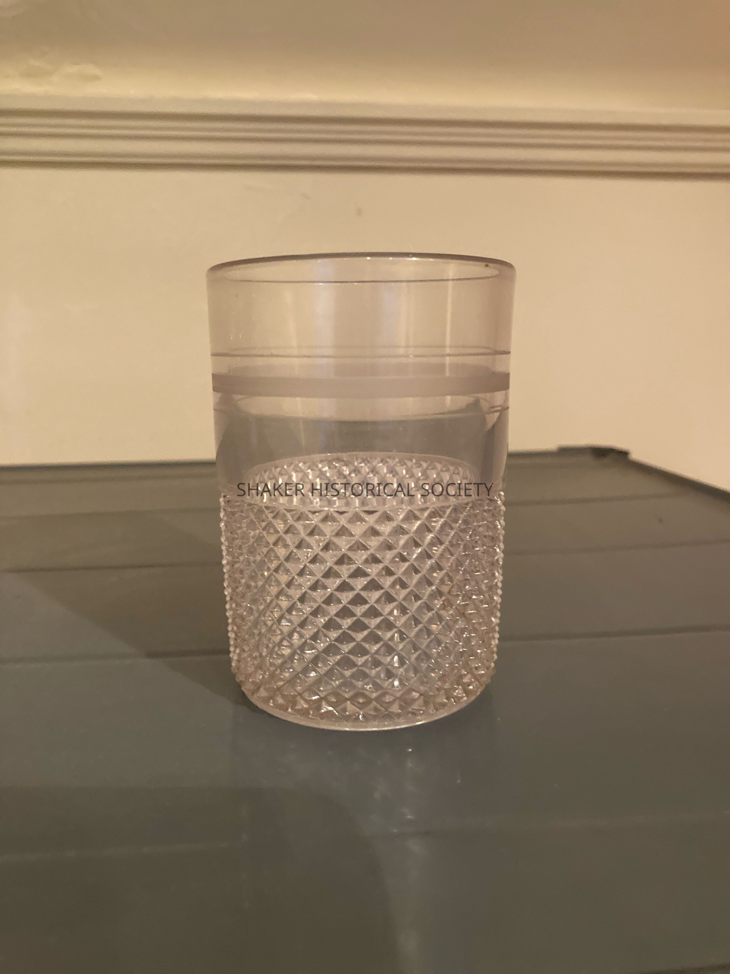Glass tumbler with diamond design on bottom half and simple bands on the top half. Identical to R-292.4Location