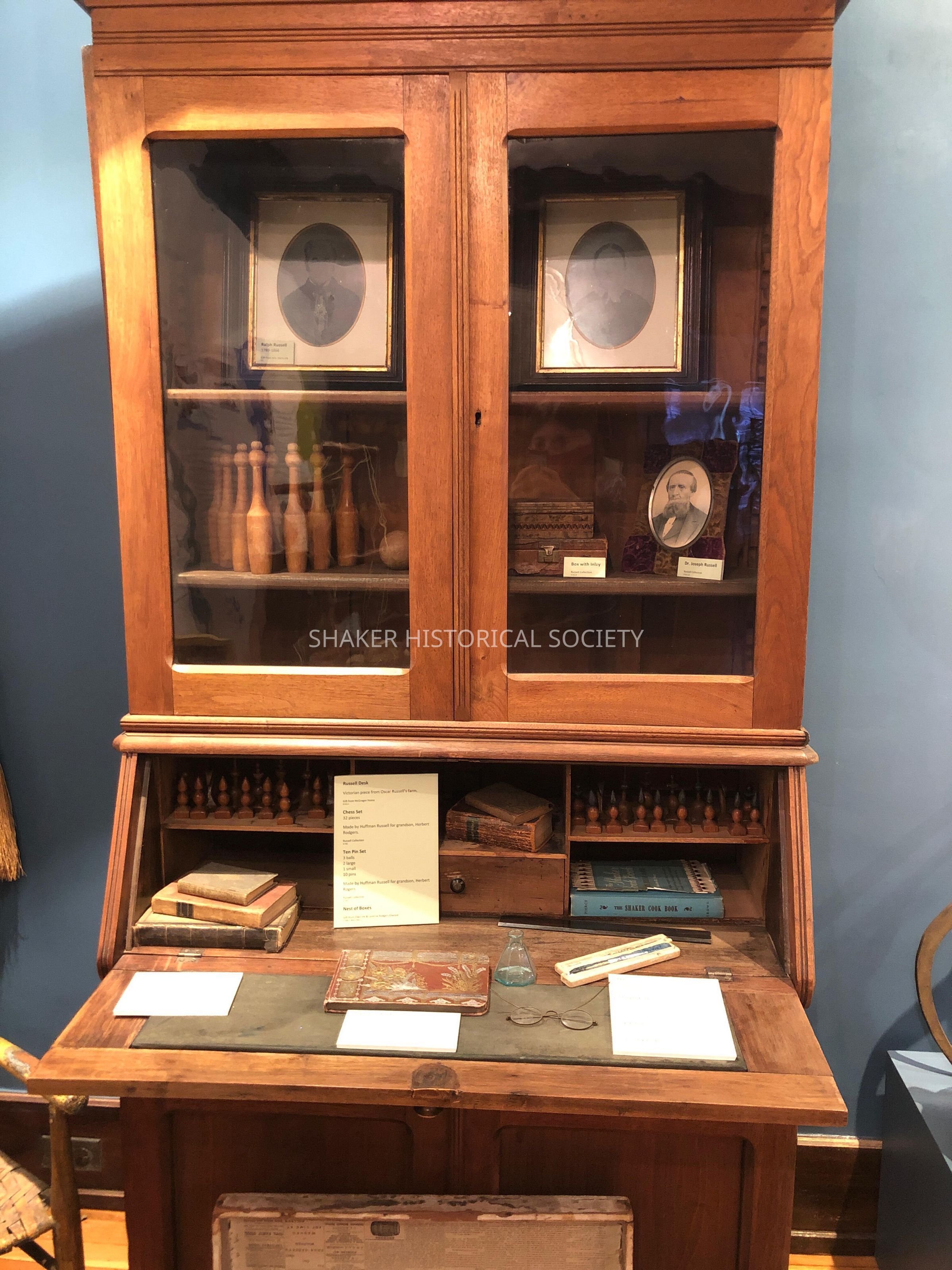 Wooden Victorian desk from Oscar Russell’s farm and was used by Grace Russell, the great-great-granddaughter of Ralph Russell, founder of North Union. Drop-front desk with two glass doored cabinets above desk.Collection