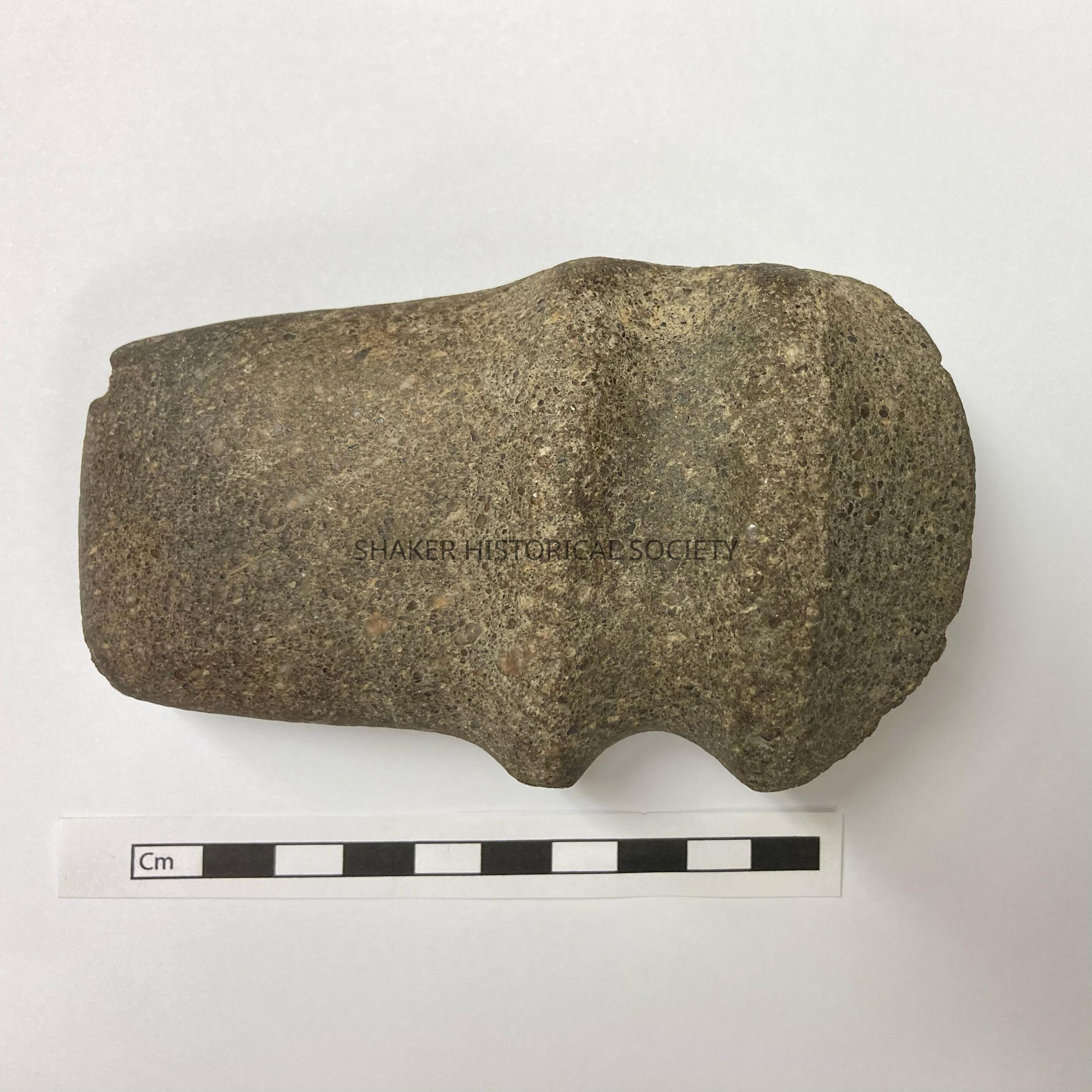 Stone grooved axe head found in 1920 in Earl Gurney Mead's driveway at 2645 Taylor Road while digging for the road bed. Location was the S.E. line for the Shaker Farm.Made/Created