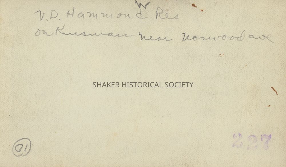 Undated black-and-white photograph of the Hammond house built in 1860 by Joshua C. Cole. Handwritten caption on verso reads: "V. D. Hammond Res on Kinsman near Norwood ave"Photograph Details