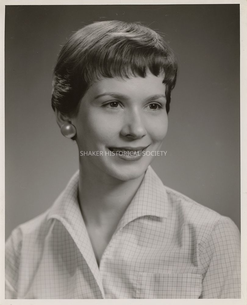 Undated black-and-white headshot by Halle-Spiegel Portrait Studios of an unidentified woman with short hair wearing a gingham collared shirt and large pearl earrings.Photograph Details
