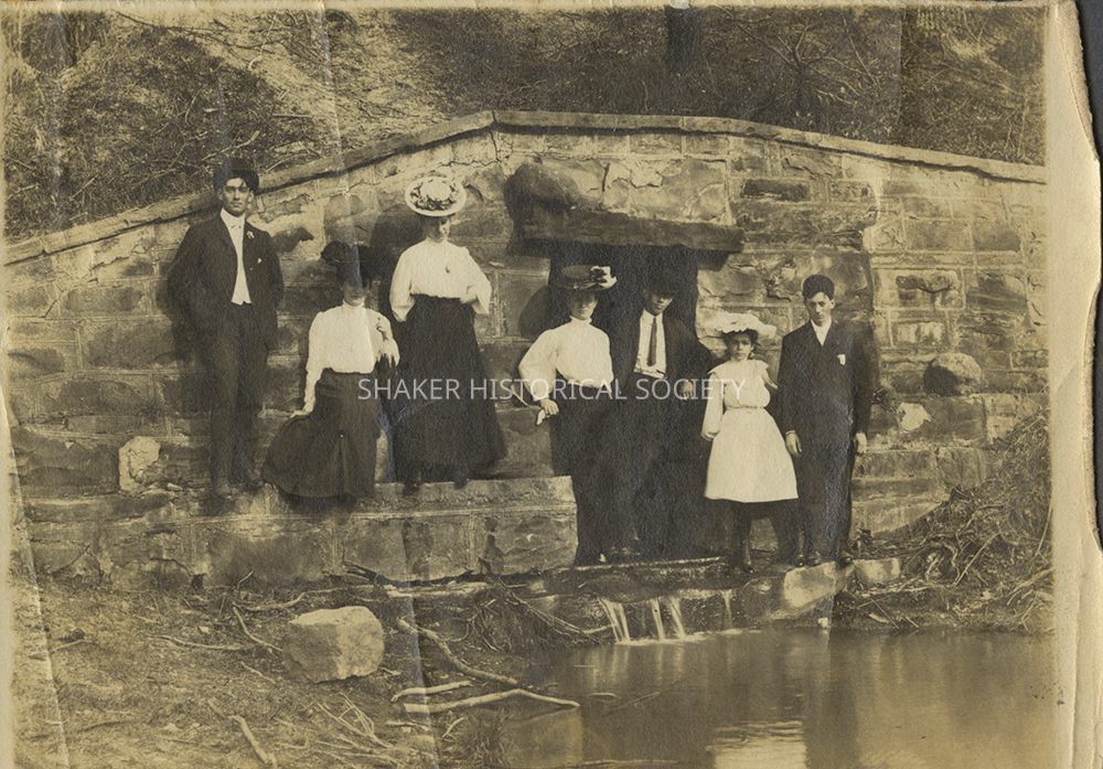Black-and-white photograph depicting three men and four women standing in front of the dam at Upper Lake (Horseshoe Lake), taken about 1906 by Ezra Hecker. From left to right: Arthur Kehres, Elizabeth Hecker, Gertrude Schwartz, John A. and Alma Hecker (in doorway), Helen Mack, and Rowland [Roland] Kehres.Photograph Details