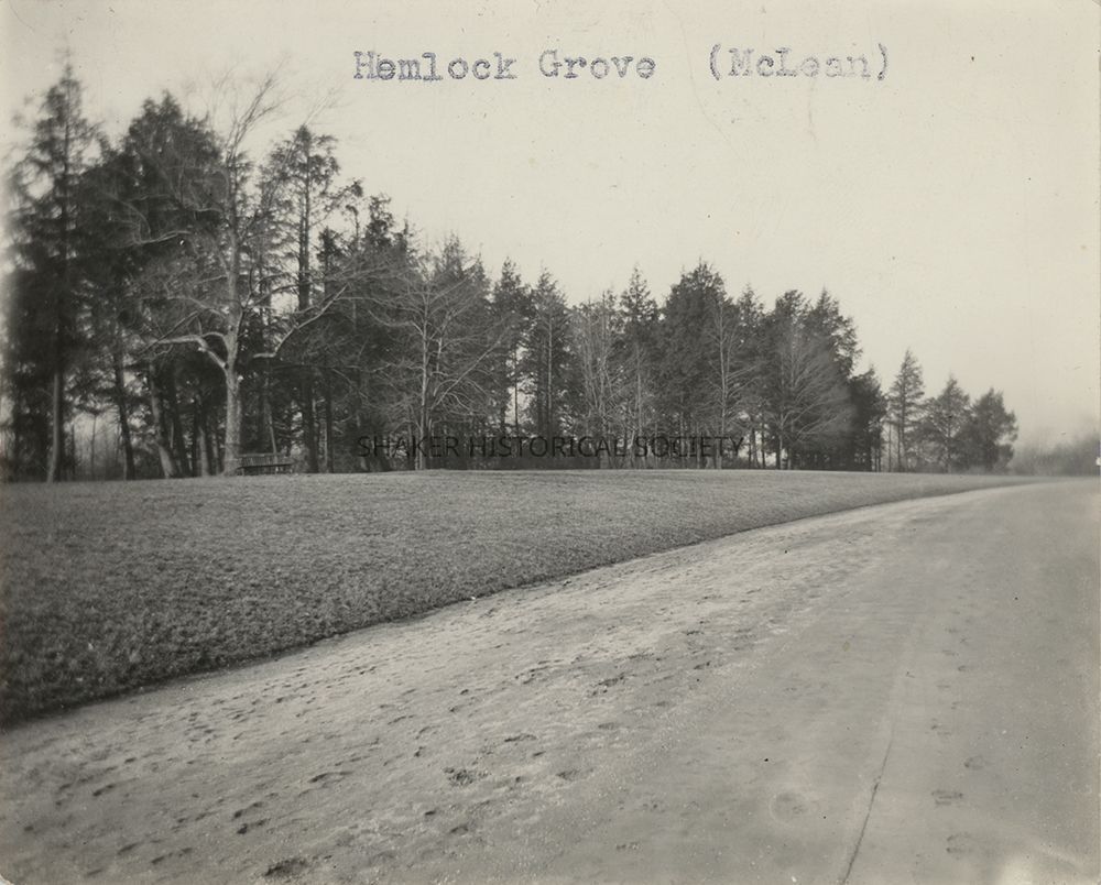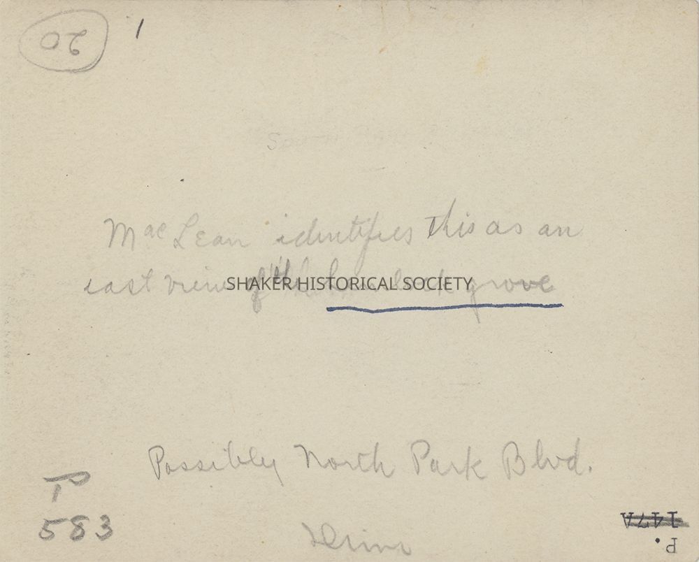 Black-and-white photograph showing an east view of the hemlock grove along present-day North Park Boulevard. Handwritten note on verso reads: "MacLean identifies this as an east view of the hemlock grove. Possibly North Park Blvd." Print was possibly made from a glass plate negative based on the blurred edges. Photo is identical to Plate 57 in Louis Baus' Shakers & Kirtland.Photograph Details