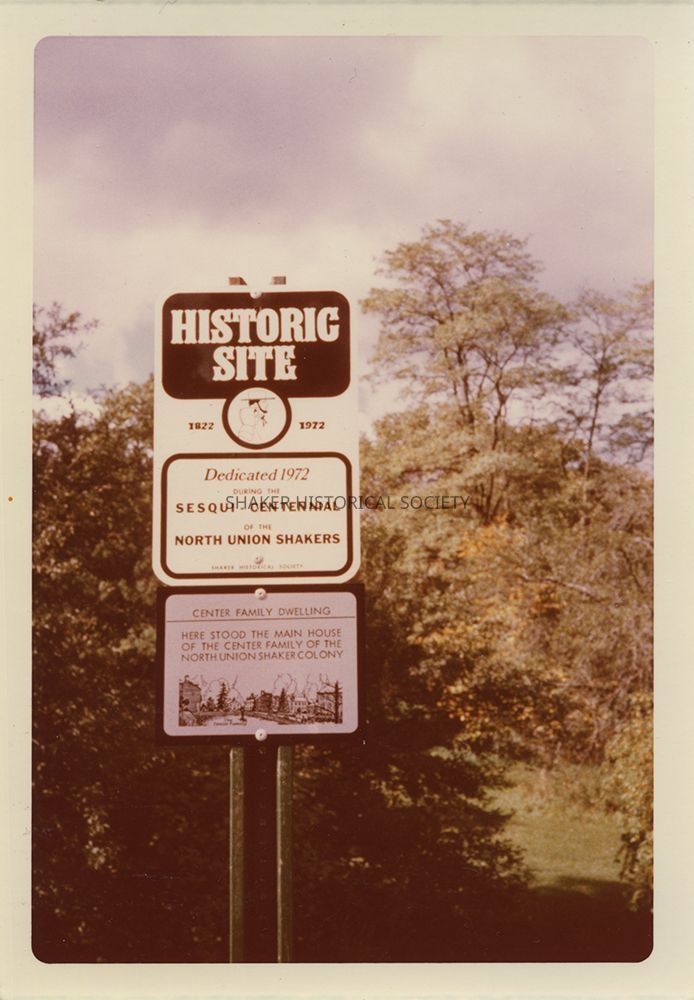 Color photograph of the historic marker at the site of the North Union Center Family dwelling, dedicated in 1972 by the Shaker Historical Society. Photo has noticeable color shift.Photograph Details