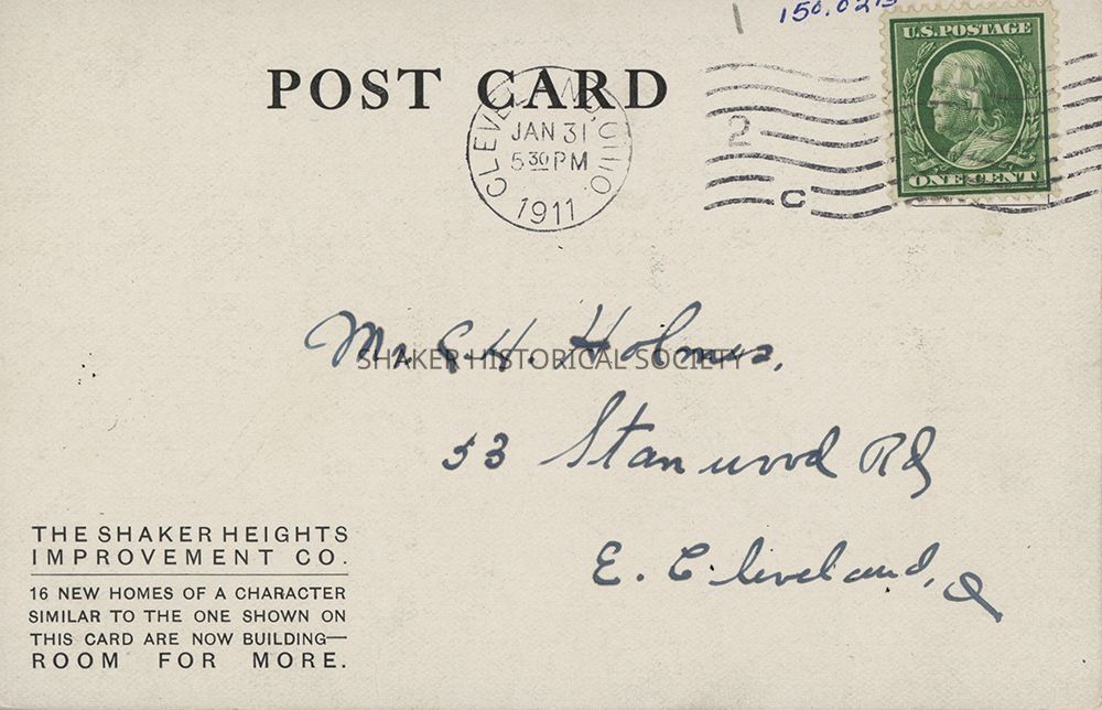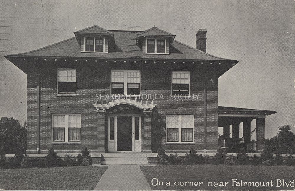 Black-and-white photograph postcard of an unidentified house "on a corner near Fairmount Blvd." The postcard was promotional material for The Shaker Heights Improvement Co., and the caption on verso reads: "16 new homes of a character similar to the one shown on this card are now building—ROOM FOR MORE." Postcard is postmarked January 31, 1911 and was sent to Mr. [illegible letter] H. Holmes, 53 Stanwood Rd, East Cleveland, Ohio.Subject Person/Organization