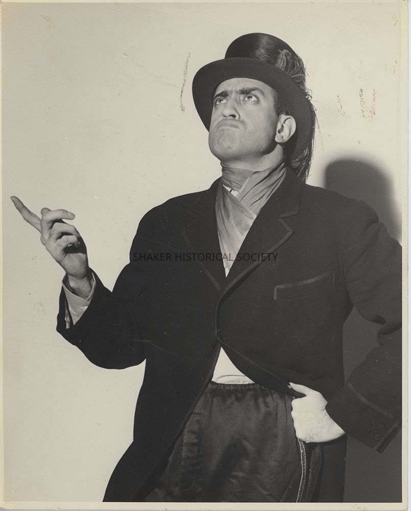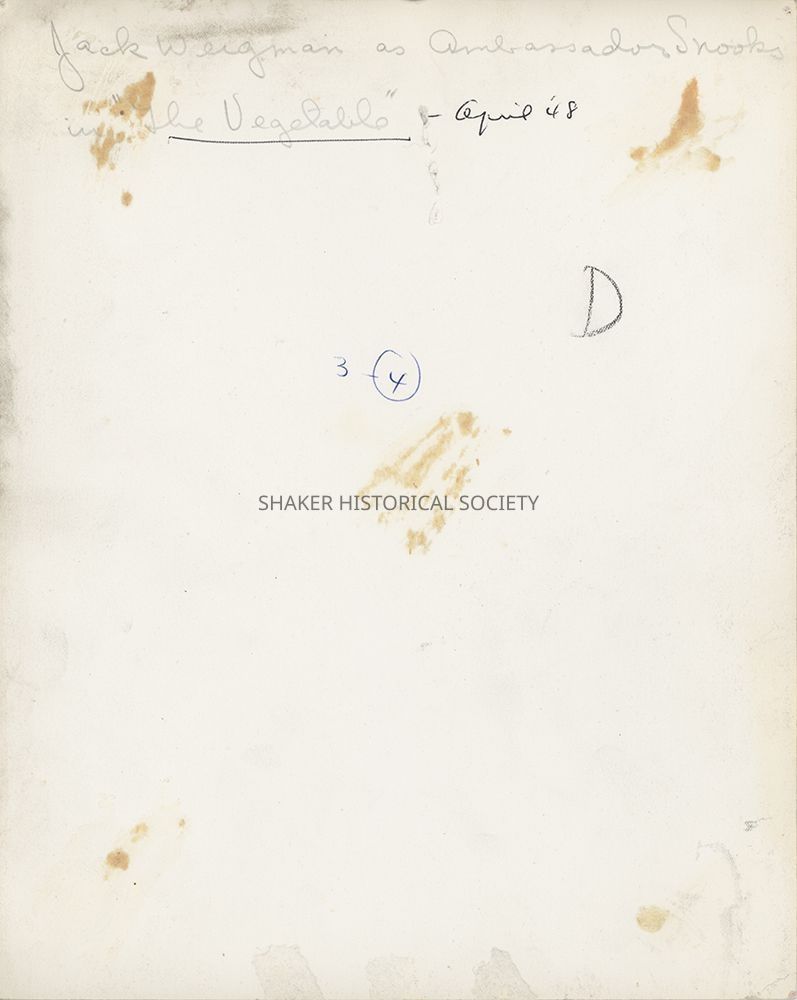 Black-and-white press photograph of Shaker Players cast member Jack Weigman as The Ambassador in "The Vegetable." Identifying information on verso.Photograph Details
