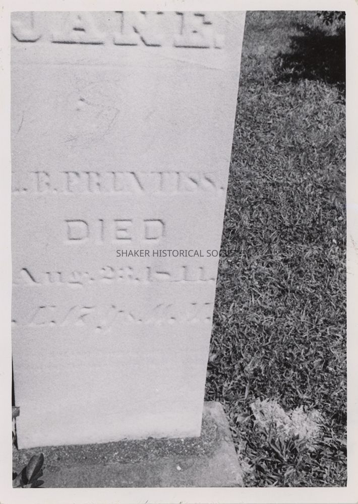 Black-and-white photograph of a portion of Jane Prentiss' gravestone at Warrensville West Cemetery.
