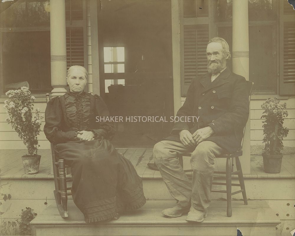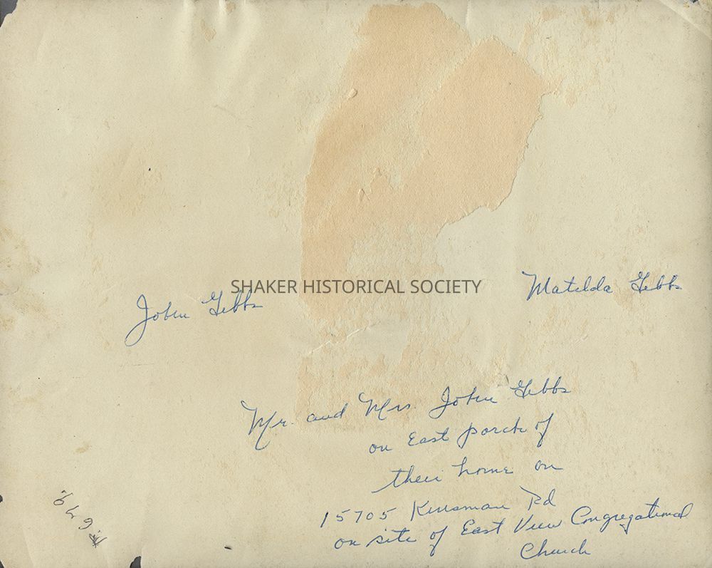 Undated photograph from a Warrensville Township scrapbook (SCR WAR 5) depicting Matilda and John Gibbs sitting on the east porch of their home located at 15705 Kinsman Road, later the site of East View Congregational Church.Photograph Details