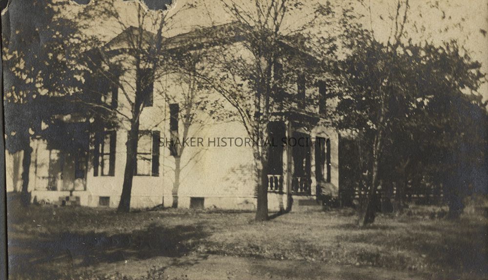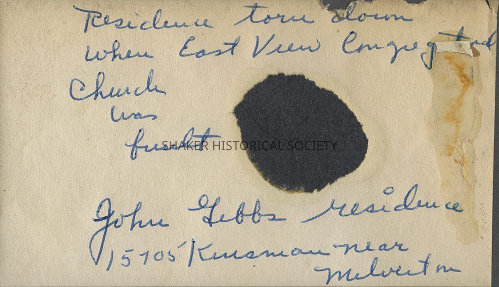 Undated photograph from a Warrensville Township scrapbook (SCR WAR 4) depicting the John Gibbs house located at 15705 Kinsman Rd. The house was demolished to build East View Congregational Church. The back of the photograph has handwritten information and a portion of torn black paper.Location