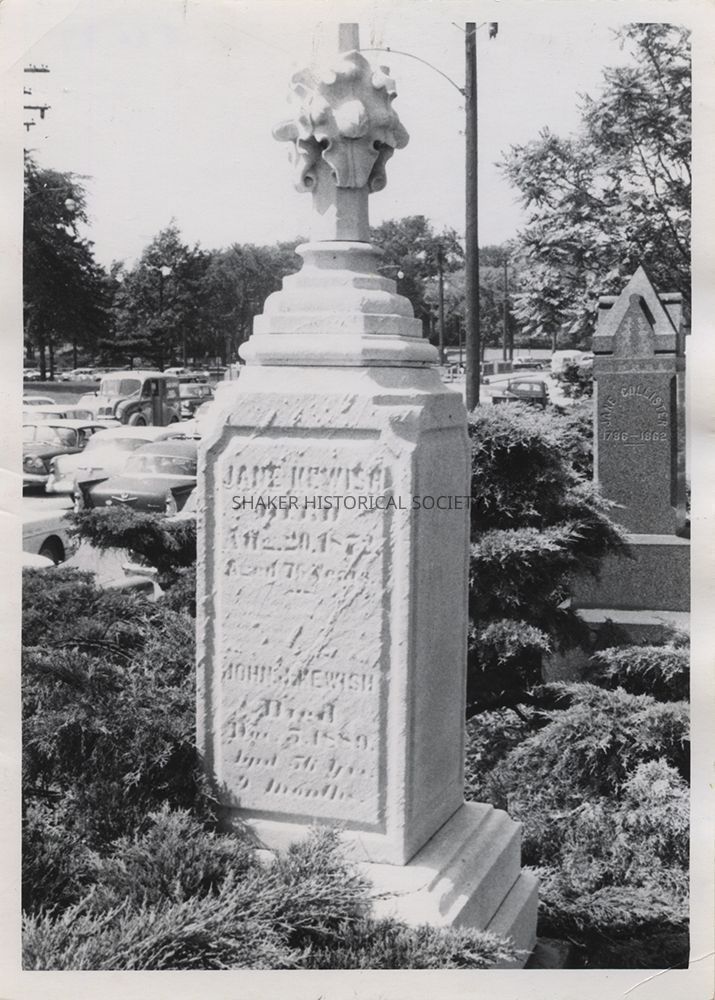 Black-and-white photograph of the Kewish family grave marker at Warrensville West Cemetery along Lee Road. Photograph taken by Howard V. Luce around June 28, 1958. Names of Jane Kewish (d. 1872) and John Kewish (d. 1889) are visible on the stone.Photograph Details