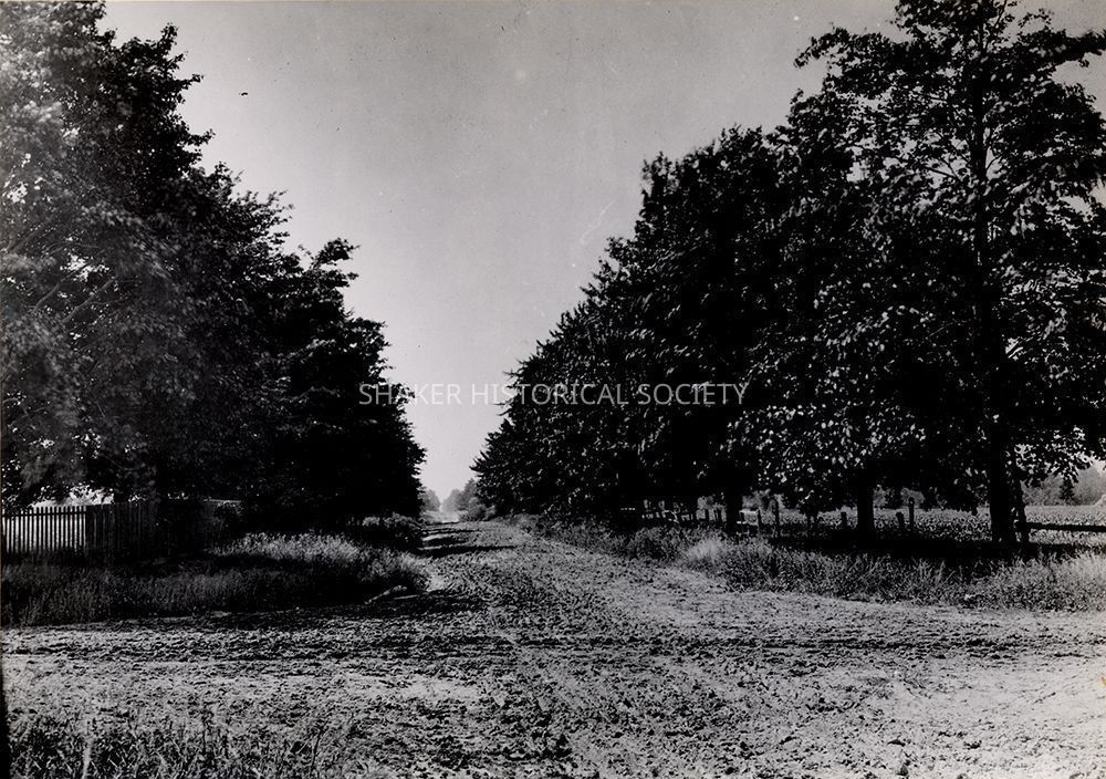 Baus description: "From Fairmount Blvd. looking south on Lee Rd at the old Shaker property, where the trees appear in the distance was the location of the Center Family. At the time Fairmount Rd. was the main outlet of the village on the north, and Woodland on the south."Photograph Details