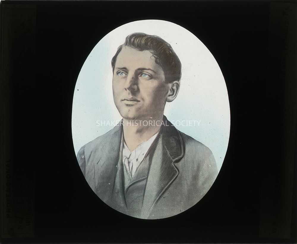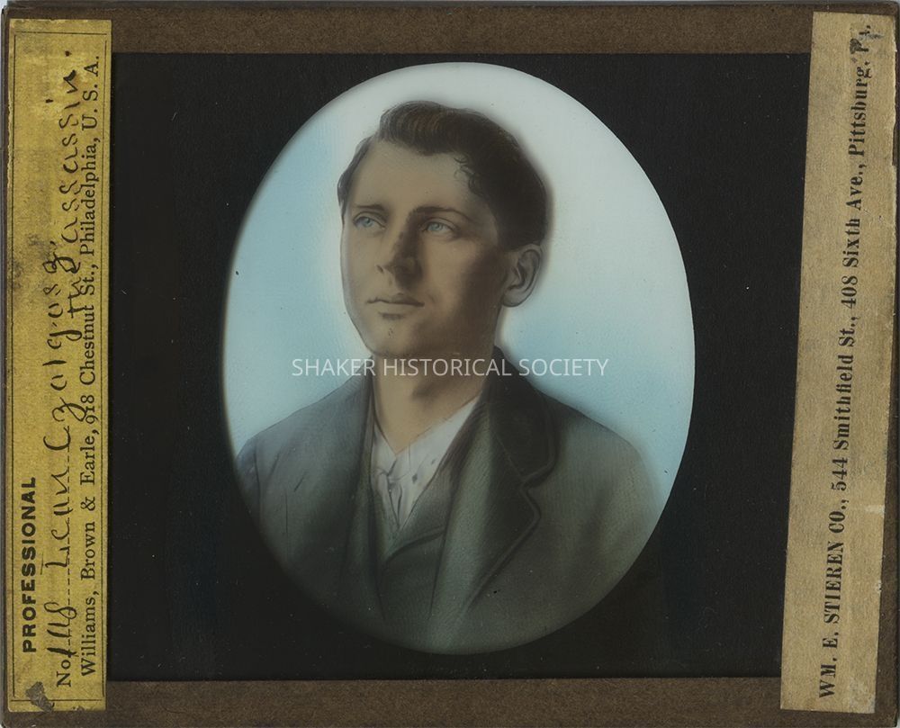 Hand-colored black-and-white glass lantern slide showing Leon Czolgosz, President William McKinley's assassin. A label for Williams, Brown & Earle of Philadelphia, Pennsylvania, which manufactured and sold optical projection devices, is along the left side, and a label for William E. Stieren Co. of Pittsburgh, Pennsylvania is along the right. Czolgosz lived with his father, stepmother and brothers and sisters on a small farm on the north side of what is now Harvard Road, just east of Richmond Road near the Orange Township line.Photograph Details