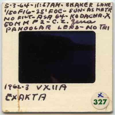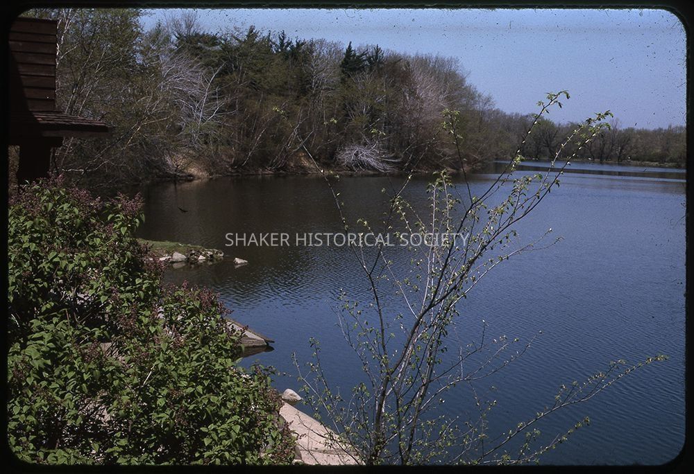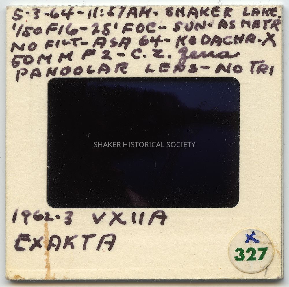 Color slide (Kodachrome X) by Ladis Lisy of Lower Lake with the Shaker Lakes Canoe Club visible on the left side. Slide mount is annotated with photographic technical information.Photograph Details