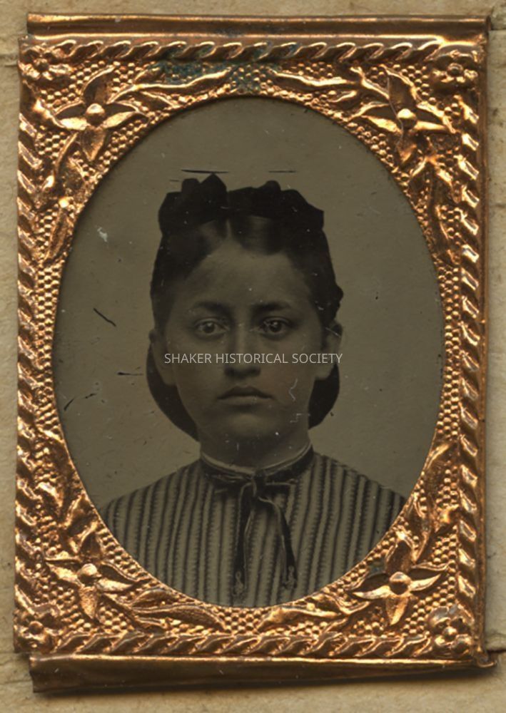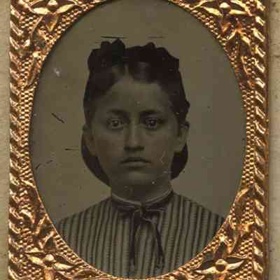 Tintype gem portrait of a teenage girl identified as Lydia Barber, sister of Lyman Barber, on verso. Tintype features some hand tinting on the subject's face and is mounted in an elaborate miniature frame to a decorative cartes-de-visite size card.Photograph Details