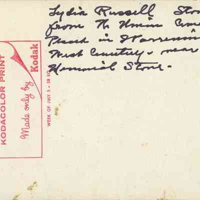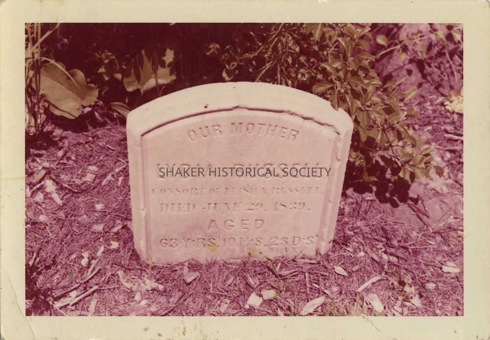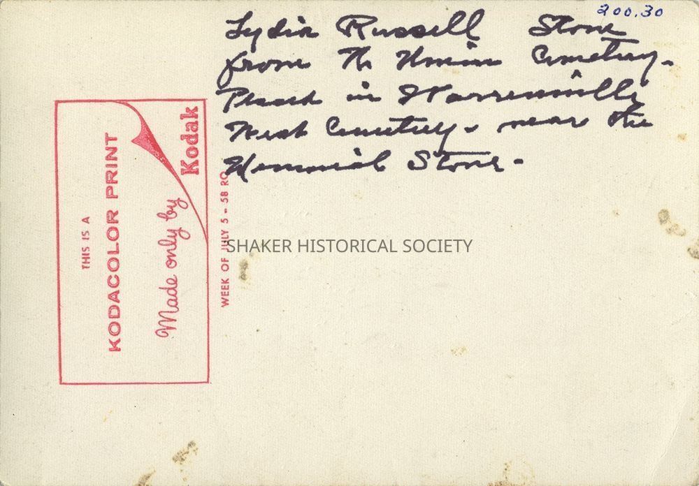 Color photograph of Lydia Russell's headstone, moved from the North Union Shaker cemetery to Warrensville West Cemetery near the Shaker memorial. Color shift evident; image exhibits yellow-magenta cast consistent with cyan dye fading.Photograph Details