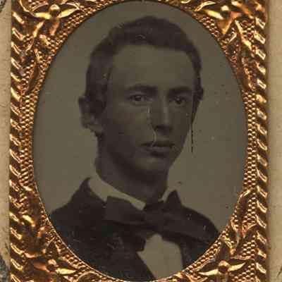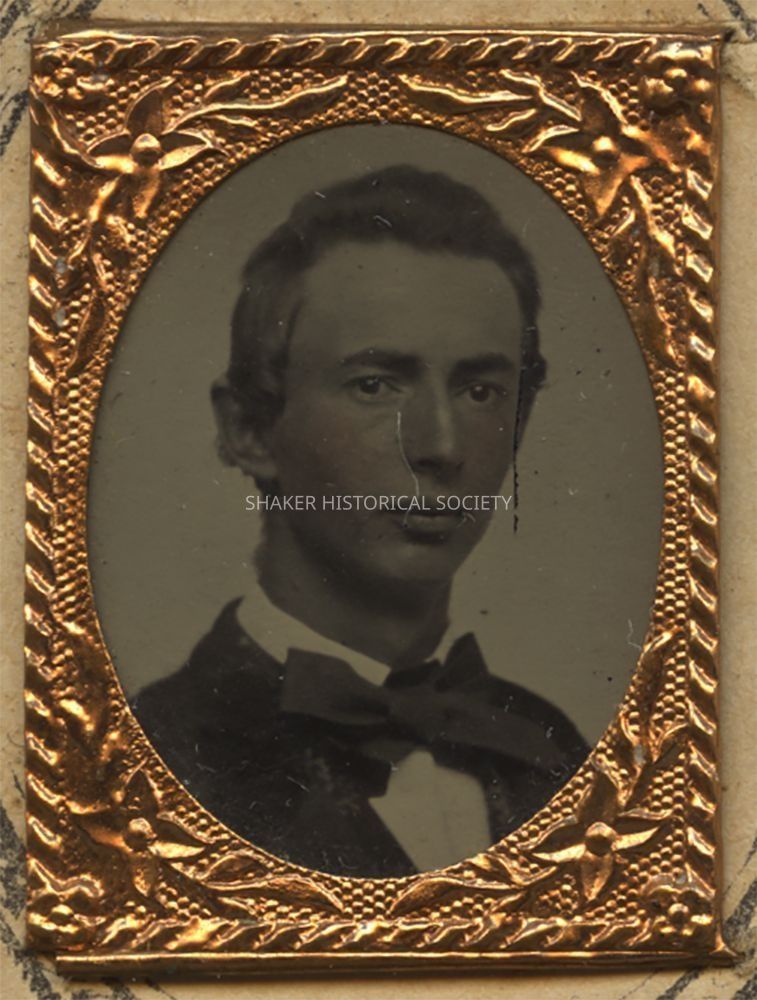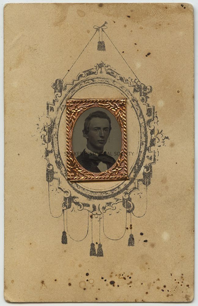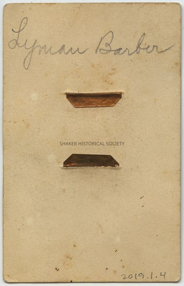 Tintype gem portrait of a teenage boy identified as Lyman Barber, brother of Lydia Barber, on verso. Tintype features some hand tinting on the subject's face and is mounted in an elaborate miniature frame to a decorative cartes-de-visite size card.Photograph Details
