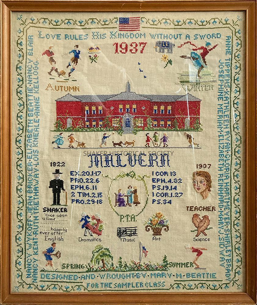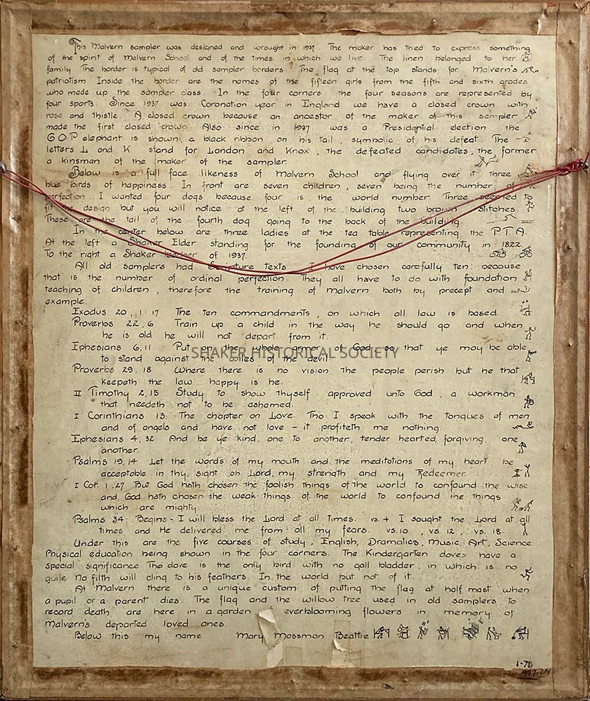 Framed sampler designed and sewn by Mary Mossman Beattie of Malvern School's sampler class in 1937. The school is prominently depicted and surrounded by bible verses and images representing the seasons, school subjects, and community history. The names of other students in the class are along the border. A handwritten description of the sampler and it's meaning is on the back of the sampler (full transcription available).Acquisition