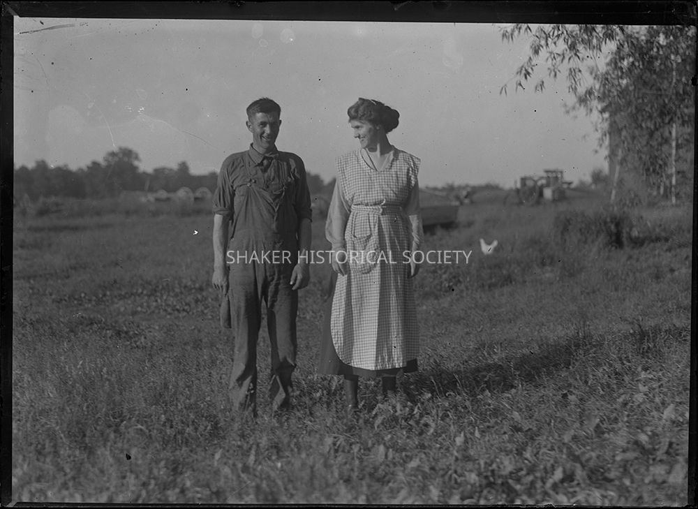 Glass plate negative showing an unidentified man and unidentified woman, presumably members of the Murfett and/or Palmer family, standing in a field. A chicken and farming equipment is visible in the background.Photograph Details