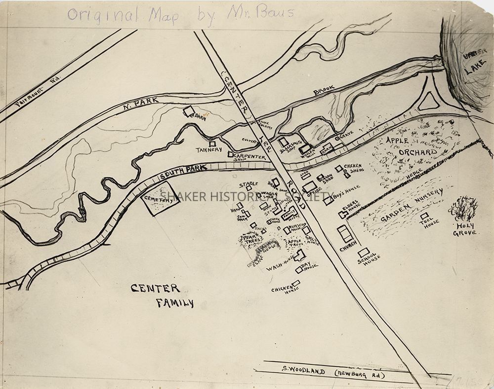 Copy of a hand-drawn map of the North Union Shaker Village Center Family. The original map was drawn by photographer Louis Baus.Collection