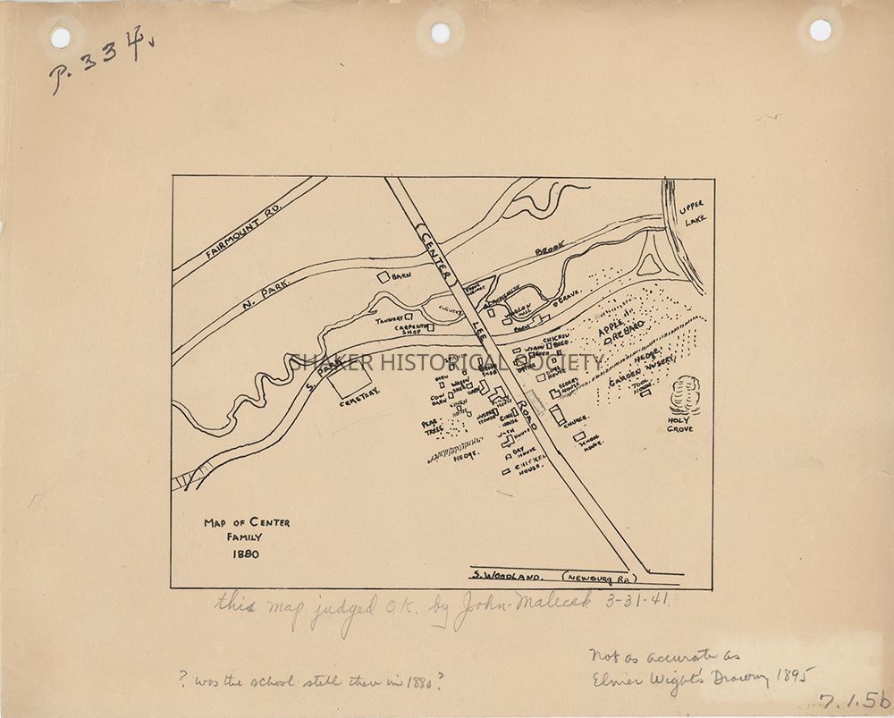 Copy of a hand-drawn map of the North Union Shaker Village Center Family, 1880. Handwritten notes on the map indicate this map is not as accurate as Elmer Wight's 1895 drawing.Collection