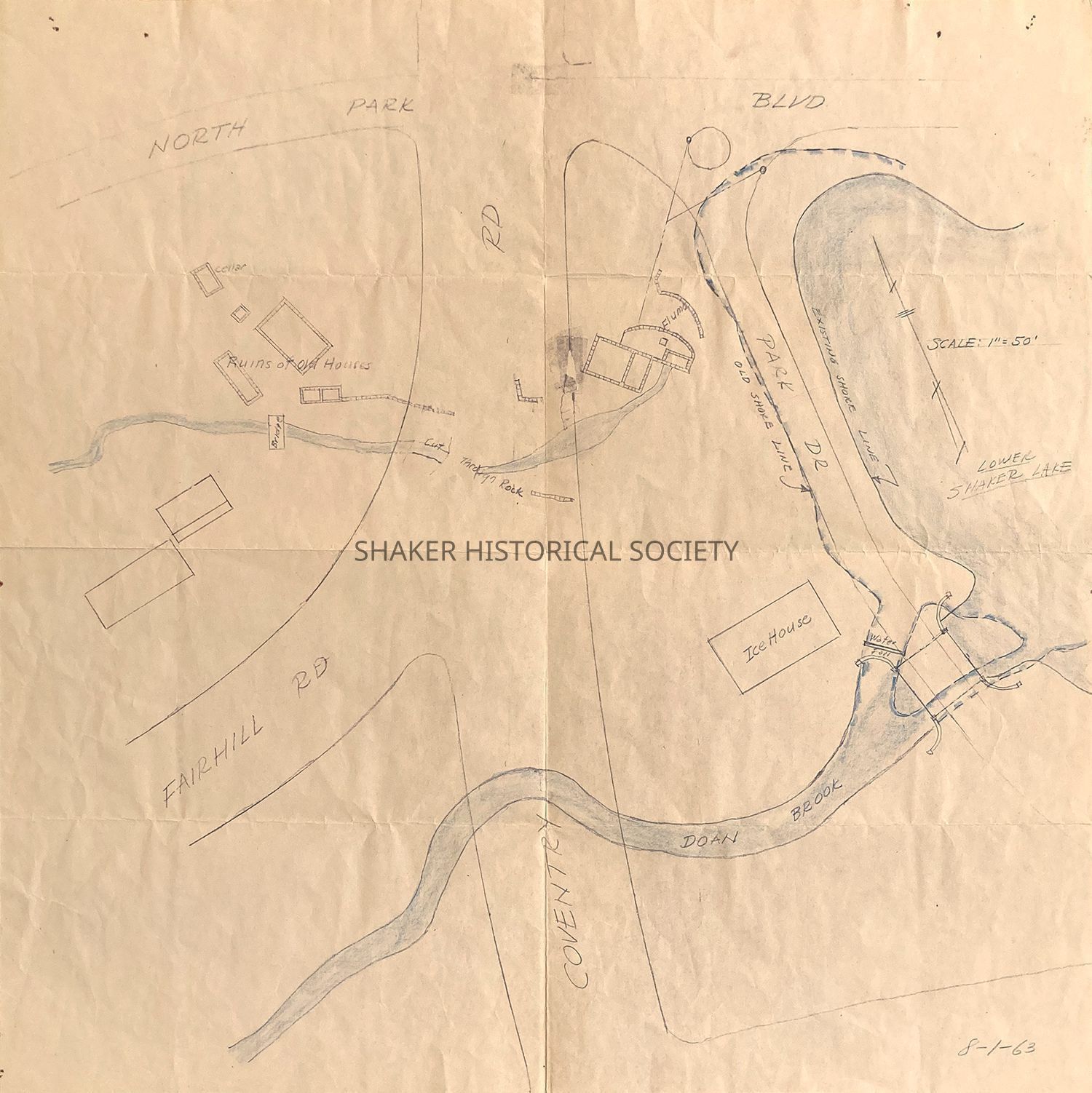 Hand-drawn map of the intersection of North Park Boulevard and Fairhill Road with Coventry Road, including the western portion of Lower Shaker Lake, Park Drive (now Brook Road), and Shaker structures. "Bill Bell, wastonian[?] 100" written in child-like handwriting on verso. Scale: 1" = 50'Collection
