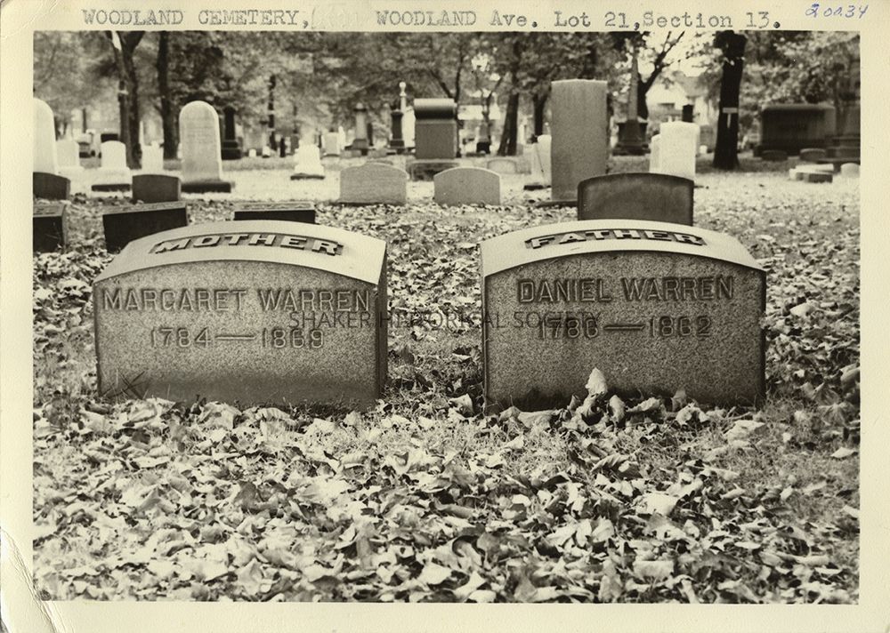 Black-and-white photograph on yellowed paper of the headstones of Margaret Warren (1784-1869) and Daniel Warren (1786-1862) at Woodland Cemetery. Photo is identical to 470.03 and 200.17.Photograph Details