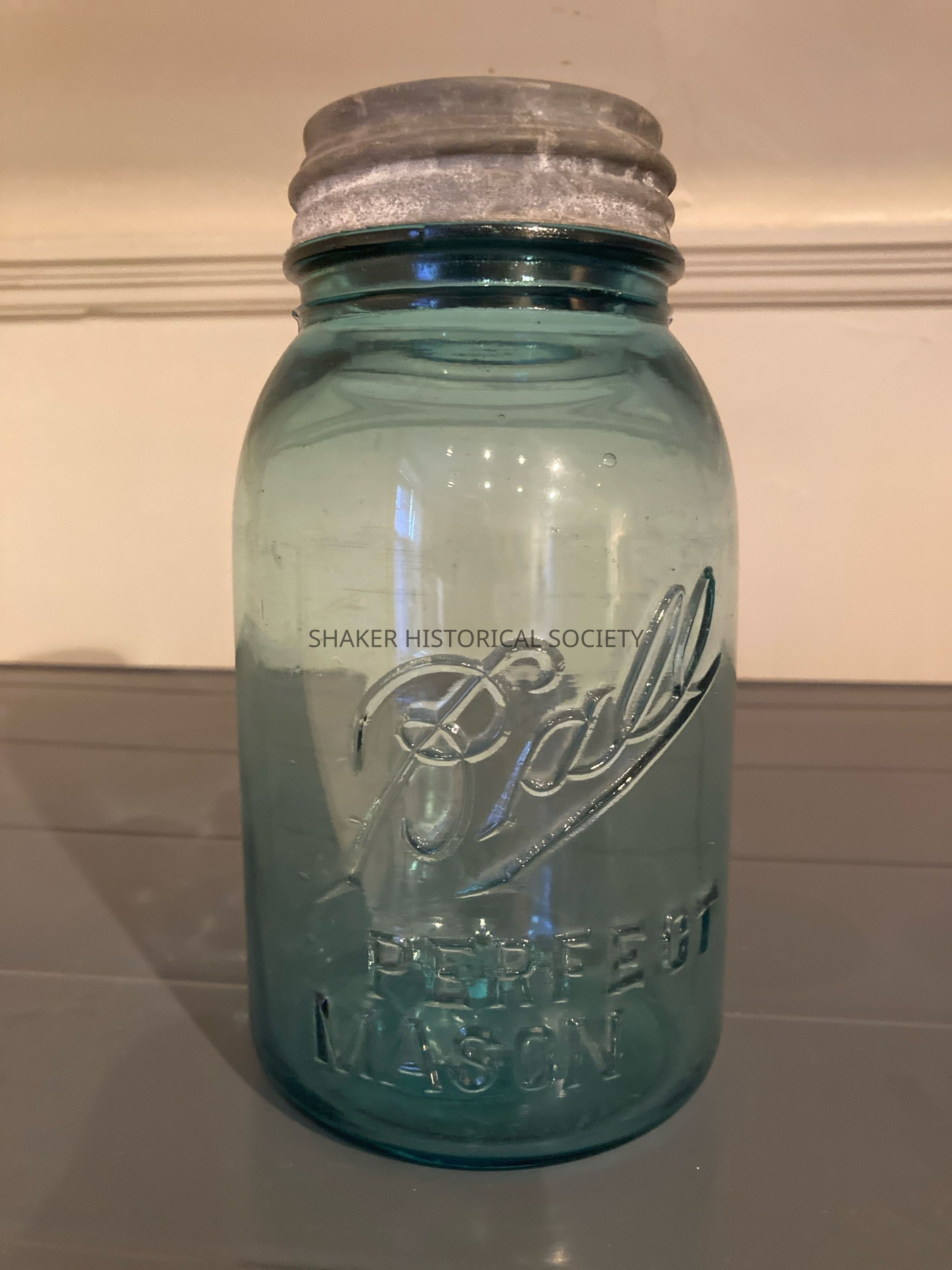Quart-size Ball "perfect mason" jar made of blue glass with a metal lid.Other Names and Numbers