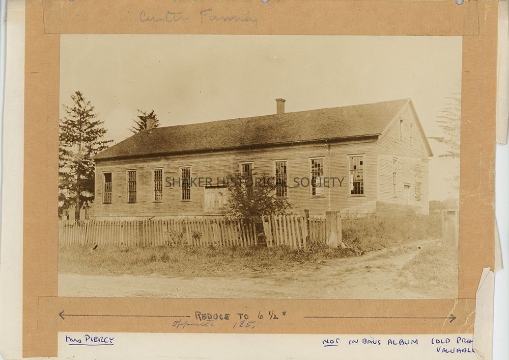 Undated black-and-white photograph of the North Union Shaker Meeting House (church) located along Lee Road. Photo is taped to a piece of paper with handwritten notes. Image is very similar to 2024.3.12.Photograph Details