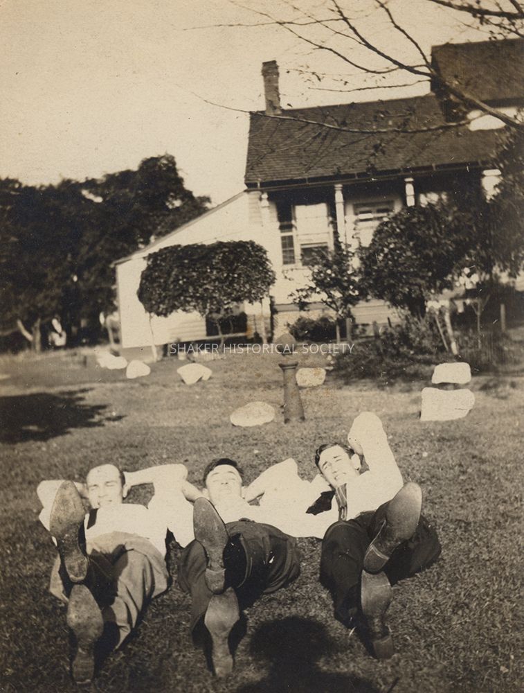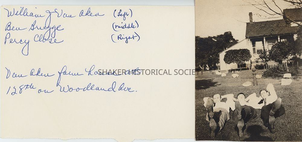 Undated black-and-white photograph of three men lying on the ground at the Van Aken farmhouse located at E. 128th (now Kendall) and North Woodland (now Larchmere). The photo is taped to a piece of paper identifying the people (left to right): William J. Van Aken, Ben Brugge, and Percy Close.Photograph Details