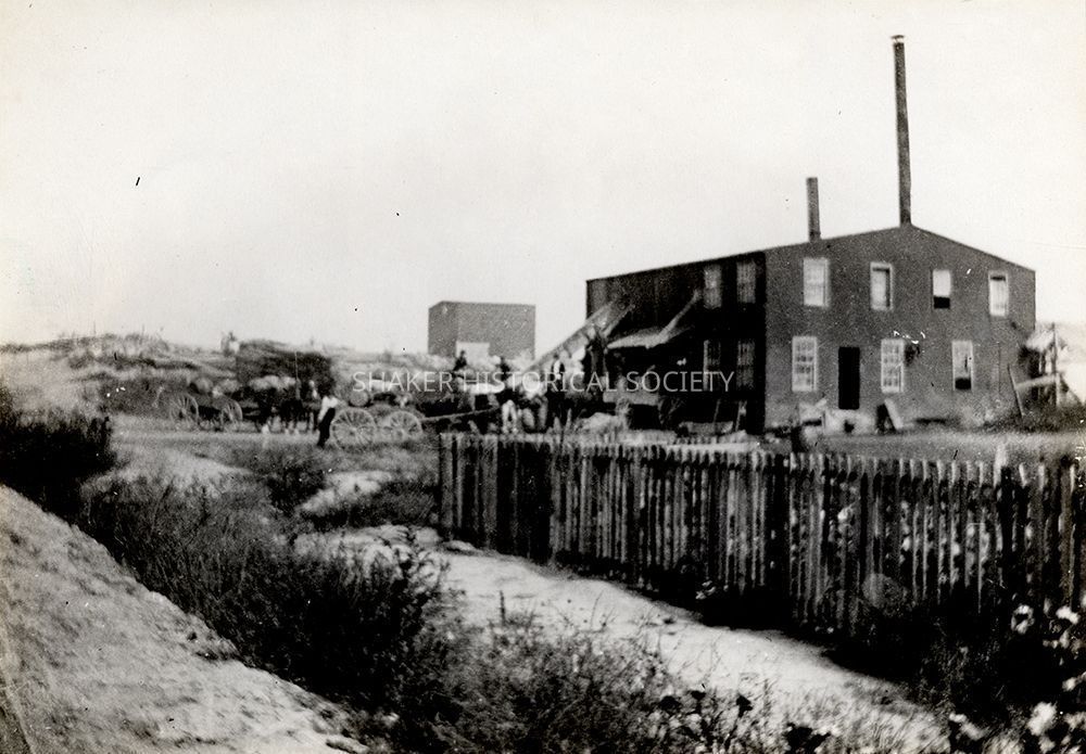 Unnumbered plate from Shakers & Kirtland by Louis Baus showing a southwest view of George Mighton's feed mill, sawmill, and cider mill on the east side of Warrensville Center Road north of the Warrensville Methodist Episcopal Church.