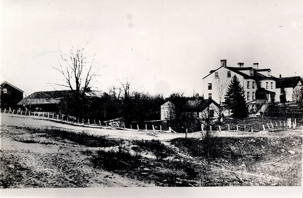 Baus description: "The Mill or North Family House was built in 1838, near the end of the lower lake; west of the present Coventry Rd. At the right of the home is the cheese house. The spring house at the left. On the extreme left, across the bridge over the creek are the horse barns and wagon shed.