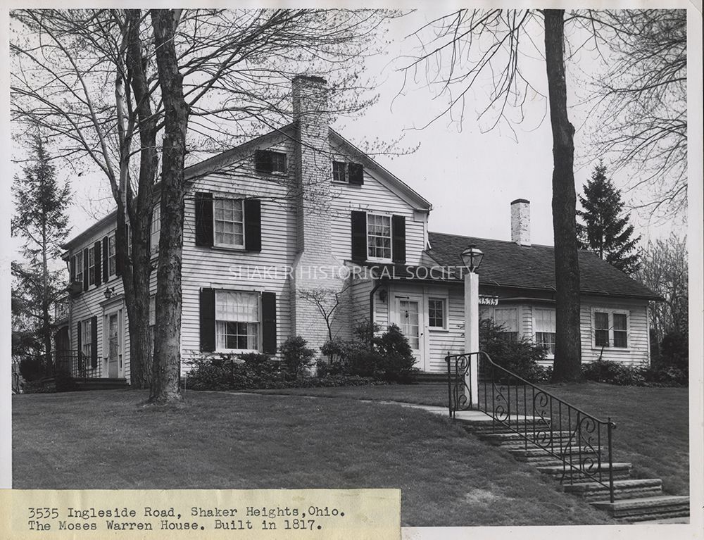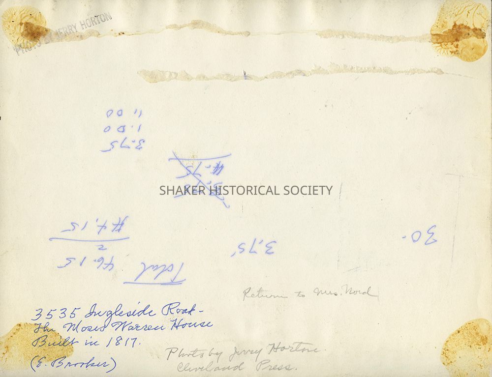 Black-and-white photograph from a Warrensville Township scrapbook (SCR WAR 4) of the Moses Warren House, located at 3535 Ingleside Road, taken by Jerry Horton of The Cleveland Press, c.1950s. The house was built by Moses Warren Sr. in 1817 and later sold to John Palmer.Photograph Details