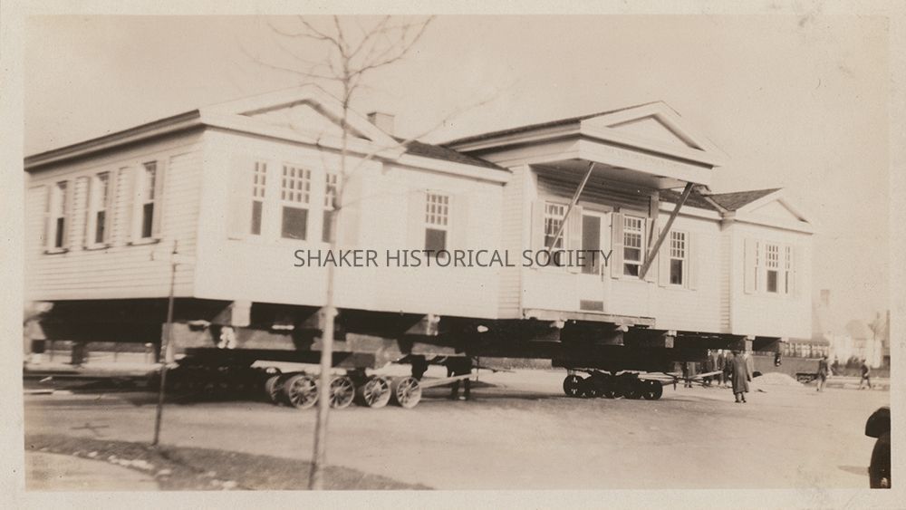 Black-and-white photograph of the Van Sweringen Company sales office being moved from it's original location at Shaker Boulevard and Coventry Road to Shaker Boulevard and Warrensville Center Road. The building was relocated c.1929 based on addresses listed in newspaper advertisements.Photograph Details
